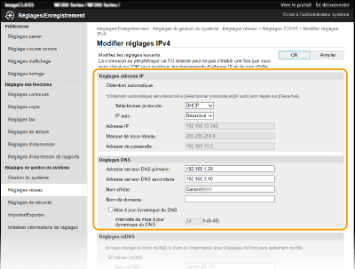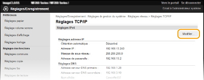 Vous pouvez modifier les réglages de l'appareil par le biais de l'IU distante. Il est possible de configurer la plupart des réglages au niveau de l'appareil lui-même, mais certains d'entre-eux doivent être modifiés par l'IU distante. Cette section décrit la procédure générale pour modifier les réglages de l'appareil depuis l'IU distante.