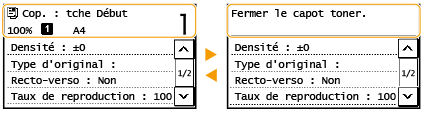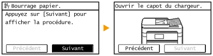 Dans certains cas, lorsqu'une erreur se produit, les instructions permettant d'y remédier s'affichent. Suivez ces instructions pour corriger l'erreur. L'écran apparaissant en cas de bourrage papier est reproduit ci-après à titre d'exemple.