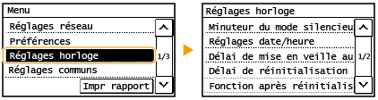 Vous pouvez changer l'écran qui s'affiche automatiquement en cas d'inactivité de l'appareil pendant le laps de temps défini : <Fonction après réinitialisation auto.>
