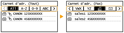 Vous pouvez enregistrer dans le carnet d'adresses les destinataires de télécopie ou de numérisation fréquemment utilisés afin de les sélectionner facilement en cas de besoin (Enregistrement de destinataires dans le carnet d'adresses). Vous pouvez rechercher les destinataires par ordre alphabétique dans les listes du carnet d'adresses ou en saisissant un code à trois chiffres (numéro de composition codée). Vous pouvez également spécifier des destinataires plus rapidement en utilisant les fonctions suivantes.