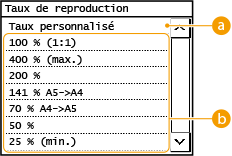 Vous agrandissez ou réduisez les copies en appliquant un taux de reproduction prédéfini, <141% A5->A4> par exemple, ou en définissant un taux de reproduction personnalisé par incréments de 1 %.