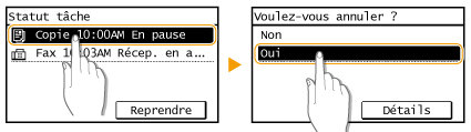 Les originaux ont été numérisés et attendent d'être imprimés. Sélectionnez un document dont vous voulez annuler la copie, puis sélectionnez <Oui>.