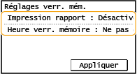 Pour imprimer les documents reçus et placés en mémoire, définissez <Réglages verrouillage de la mémoire> sur <Désactivé>. Tous les documents figurant en mémoire s'impriment alors.