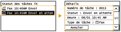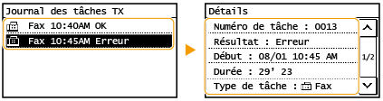 Si <Afficher le journal des tâches> est réglé sur <Désactivé>, vous ne pouvez pas consulter les journaux de communication. <Afficher le journal des tâches>