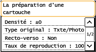 Vous pouvez régler n'importe quelle valeur sous forme de pourcentage de la quantité d'encre restante dans la cartouche de tambour et qui déclenche l'apparition de ce message. <Afficher heures notif. prép. cartouche>