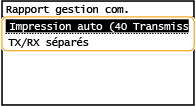 Résultat de communicationEn cas d'erreur de transmission d'e-mail ou lors de l'enregistrement d'un document dans un dossier partagé, aucun code d'erreur n'est indiqué dans le rapport. Pour connaître le code d'erreur, vous devez imprimer un rapport de gestion de communication. Rapport de gestion de communication (Modèle à écran tactile)