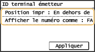 Indique la position où il convient d'imprimer les informations sur l'ID du terminal émetteur dans le fax envoyé. Sélectionnez <Dans la zone de l'image> pour imprimer les informations dans la zone de l'image ou <En dehors de la zone de l'image> pour les imprimer hors de cette zone.