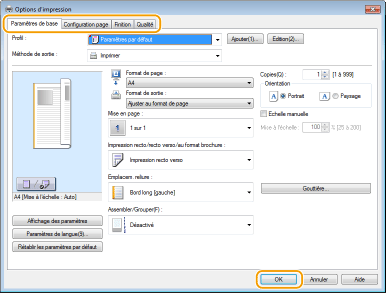 Faites les réglages nécessaires pour l'impression et cliquez sur [OK].