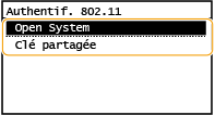 Lorsque vous connectez un réseau local sans fil, l'appareil peut être confronté à une erreur d'authentification si l'authentification de type clé partagée est définie sur le routeur sans fil. Si cela se produit, l'appareil modifie automatiquement le réglage, sélectionne <Clé partagée> et retente la connexion.