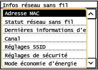 Vous pouvez afficher <Statut réseau sans fil> et <Dernières informations d'erreurs> sur l'écran