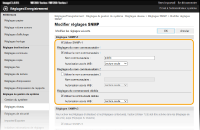 Vous pouvez également spécifier les paramètres SNMPv1 et activer/désactiver les paramètres SNMPv3 partir de l'écran <Menu>. <Réglages SNMP>