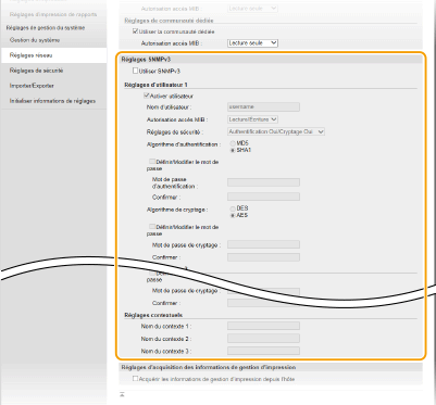 Le protocole SNMP (Simple Network Management Protocol) est un protocole dédié à la surveillance et au contrôle des périphériques de communication d'un réseau et fait intervenir une base d'informations de gestion MIB (Management Information Base). L'appareil prend en charge la version SNMPv1 ainsi que la version SNMPv3 dotée de fonctions avancées de sécurité. Vous pouvez vérifier le statut de l'appareil à partir d'un ordinateur lorsque vous imprimez des documents ou utilisez l'IU distante. Vous êtes libre d'activer SNMPv1, SNMPv3 ou encore les deux protocoles à la fois. Indiquez les réglages de chaque version de façon à les adapter à votre environnement réseau et à l'utilisation du réseau.