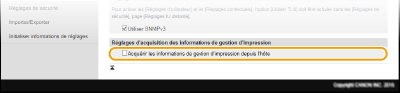 Cochez la case pour activer la surveillance des informations de gestion d'imprimante de l'appareil via SNMP. Pour désactiver la surveillance, décochez la case.