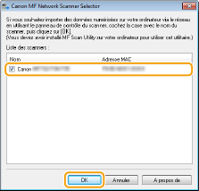 Pour utiliser cet appareil comme un scanner, vous devez effectuer plusieurs opérations préparatoires, notamment l'installation d'un logiciel sur un ordinateur. Pour en savoir plus, consultez les manuels des pilotes utilisés sur le site Web des manuels en ligne. Dans Windows, pour connecter l'appareil à un ordinateur via un réseau filaire ou sans fil, vous devez l'enregistrer au moyen de "MF Network Scanner Selector" en suivant la procédure ci-dessous. Cette procédure n'est pas nécessaire si l'appareil et votre ordinateur sont raccordés en USB.