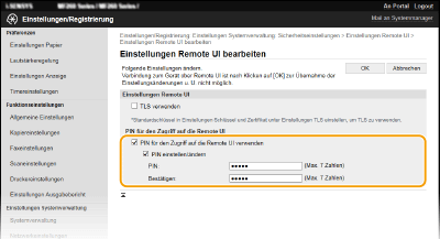 Wenn Sie dieses Kontrollkästchen aktivieren, müssen Sie eine PIN für den Zugriff auf Remote UI eingeben.