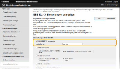 Aktivieren Sie das Kontrollkästchen [IEEE 802.1X verwenden], und geben Sie den Login-Namen in das Textfeld [Login-Name] ein.