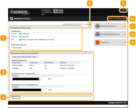 Wenn Sie sich bei Remote UI anmelden, erscheint die folgende Portalseite. In diesem Abschnitt werden die auf der Portalseite angezeigten Elemente und die Grundfunktionen erläutert.