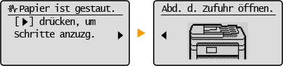 In manchen Fällen werden bei einem Problem Anweisungen angezeigt, wie auf das Problem reagiert werden soll. Befolgen Sie zum Beheben des Problems die Bildschirmanweisungen. Im Folgenden sehen Sie als Beispiel den Bildschirm, der bei einem Papierstau angezeigt wird.
