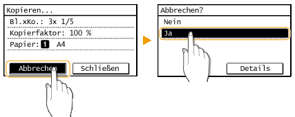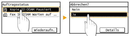 Die Originale wurden gescannt und sind zum Drucken bereit. Wählen Sie das Dokument aus, dessen Kopiervorgang abgebrochen werden soll, und wählen Sie <Ja>.