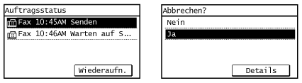 auf dem Bedienfeld. Sie können das Senden von Faxen auch nach der Überprüfung des Faxstatus abbrechen.