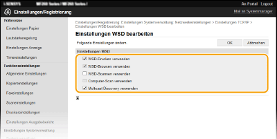 Aktivieren Sie das Kontrollkästchen, wenn Sie über WSD von einem Computer aus Informationen über das Gerät abrufen wollen. Dieses Kontrollkästchen wird automatisch aktiviert, wenn Sie das Kontrollkästchen [WSD-Drucken verwenden] aktivieren. [WSD-Scannen verwenden]