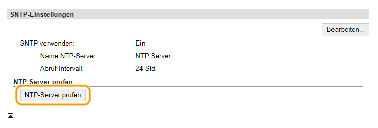 Sie können den Status der Kommunikation mit dem gespeicherten Server anzeigen, indem Sie auf [Einstellungen/Registrierung]  [Netzwerkeinstellungen]  [Einstellungen TCP/IP]  [NTP-Server prüfen] in den [SNTP-Einstellungen] klicken. Wenn die Verbindung ordnungsgemäß hergestellt wurde, wird das unten abgebildete Ergebnis angezeigt. Beachten Sie, dass die Systemuhr mit dieser Funktion nicht eingestellt wird.