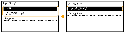 <إعدادات الفاكس>. مع ذلك، يتم تفعيل الإعدادات المحددة من <دليل العناوين> للإعدادات المفصلة الخاصة بجهات الاتصال المسجلة في دفتر العناوين. |