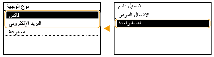 يمكنك ضبط الإعدادات المفصلة الخاصة بالوجهات <القائمة>  <إعدادات الفاكس>. مع ذلك، يتم تفعيل الإعدادات المحددة من <دليل العناوين> للإعدادات المفصلة الخاصة بجهات الاتصال المسجلة في دفتر العناوين.