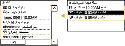 عندما يتم ضبط <عرض سجل المهمة> على <إيقاف>، فإنه لا يمكنك التحقق من سجلات الطباعة. <عرض سجل المهمة>