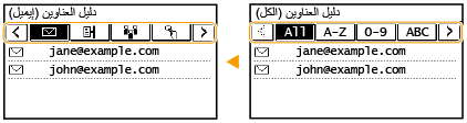 يُمَكِّنك دفتر العناوين من تحديد أي وجهة عن طريق التحديد من قائمة الوجهات المسجلة أو عن طريق البحث حسب الاسم للوجهات مع أسماء المستلمين.