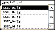 يمكنك البحث عن الموجهات اللاسلكية (أو نقاط الوصول) المتاحة للاتصال وتحديد واحد منها من شاشة الجهاز. فيما يتعلق بمفتاح الشبكة، أدخل مفتاح WEP أو PSK. قبل تحديد موجه لاسلكي، تحقق من معلومات الإعداد المطلوبة وقم بتدوينها، بما في ذلك مفتاح SSID ومفتاح الشبكة (