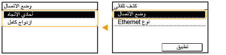 يعدّ Ethernet قياسي لاتصال البيانات ضمن شبكة المنطقة المحلية (LAN). يمكنك ضبط وضع الاتصال ونوع Ethernet. في العموم، يمكن استخدام الجهاز بدون تغيير الإعدادات الافتراضية (<إعدادات برنامج تشغيل Ethernet>)، ولكن بإمكانك تغيير هذه الإعدادات لتتناسب مع بيئة الشبكة لديك.