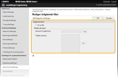 Hvis MAC-adresserne er indtastet forkert, kan du muligvis ikke få adgang til maskinen fra Fjern-UI. I dette tilfælde skal du indstille <MAC-adressefilter> til <Fra>. <MAC-adressefilter>