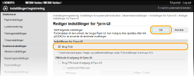 Brug af kontrolpaneletDu kan også aktivere eller deaktivere TLS-krypteret kommunikation fra <Menu>-skærmen. <Brug TLS>