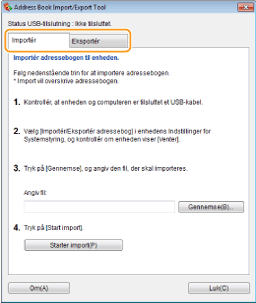 Brug Address Book Import/Export Tool (Værktøj til import/eksport af adressebogen) med den maskine og computer, der er tilsluttet via et USB-kabel.
