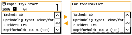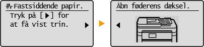 Når der opstår en fejl, vil der i visse tilfælde blive vist instruktioner i, hvordan der skal reageres på fejlen. Følg anvisningerne på skærmen for at løse problemet. Den skærm, der vises, når der opstår et papirstop, er vist som eksempel herunder.