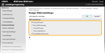 Markér afkrydsningsfeltet for at hente oplysninger om maskinen fra en computer via WSD. Afkrydsningsfeltet markeres automatisk, når afkrydsningsfeltet [Brug WSD-print] er markeret. [Brug WSD-scan]