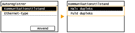 Sender og modtager kommunikationsdata skiftevis. Vælg, om maskinen er tilsluttet en netværksenhed, der anvender halv dupleks.