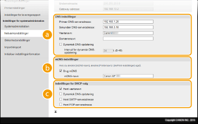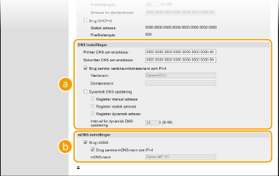 Markér afkrydsningsfeltet for dynamisk at opdatere DNS-poster, hver gang maskinens IP-adresse ændres. Hvis du vil angive den eller de typer adresser, du vil registrere til DNS-serveren, skal du markere afkrydsningsfeltet for [Registrer manuel adresse], [Registrer statisk adresse] eller [Registrer dynamisk adresse]. Hvis du vil angive intervallet mellem opdateringer, skal du angive tiden i timer i tekstfeltet [Interval for dynamisk DNS-opdatering]. [mDNS-indstillinger][Brug mDNS]