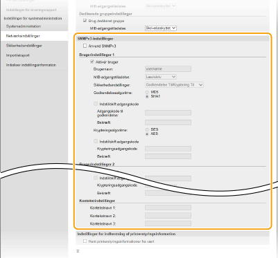 Hvis begge SNMP-versioner er aktiveret, anbefales det, at MIB-adgangstilladelse i SNMPv1 angives til [Skrivebeskyttet]. MIB-adgangstilladelsen kan indstilles uafhængigt i SNMPv1 og SNMPv3 (og for hver bruger i SNMPv3). Hvis [Læs/skriv] (fuld adgangstilladelse) vælges i SNMPv1, negerer det de robuste sikkerhedsfunktioner, der er et kendetegn ved SNMPv3, fordi de fleste af maskinindstillingerne så kan kontrolleres med SNMPv1.
