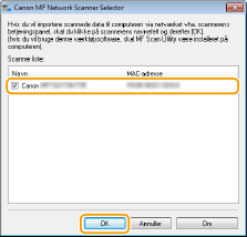 Hvis du vil bruge denne maskine som scanner, skal du gøre dig nogle forberedelser på forhånd, herunder installation af software på en computer. For mere information henvises til vejledningerne for de relevante drivere på online-hjemmesiden med vejledninger. Hvis du i Windows vil oprette forbindelse mellem maskinen og en computer via et trådløst eller kablet LAN, skal du registrere denne maskine i "MF Network Scanner Selector" ved at følge nedenstående fremgangsmåde. Denne fremgangsmåde er ikke nødvendig, hvis maskinen og din computer er forbundne via USB.