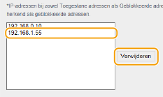 Blokkeert communicatie (inkomend) met apparaten waarvan het IP-adres is ingevoerd bij [Te registreren adres]. Er kan alleen worden gecommuniceerd met apparaten met andere IP-adressen.