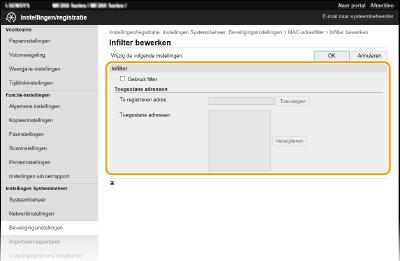 Het bedieningspaneel gebruikenU kunt ook het filteren van MAC-adressen in- of uitschakelen via het scherm<Menu>. <MAC-adresfilter>