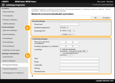 U kunt een sleutelpaar genereren met het apparaat als dit nodig is voor gecodeerde communicatie via TLS (Transport Layer Security). U kunt TLS gebruiken wanneer u het apparaat gebruikt via de externe UI. Zelf-ondertekende certificaten worden gebruikt bij de sleutel en certificaat die zijn gegenereerd in "Netwerkcommunicatie".