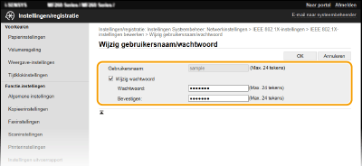 [Wijzig wachtwoord] Als u het wachtwoord wilt instellen of wijzigen, schakelt u het selectievakje in en typt u tekens voor het nieuwe wachtwoord in de vakken [Wachtwoord] en [Bevestigen].