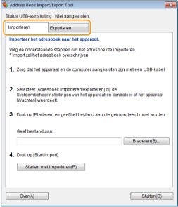 Bij gebruik van het Address Book Import/Export Tool (hulpprogramma Adresboek importeren/exporteren) moet het apparaat via een USB-kabel op de computer aangesloten zijn.