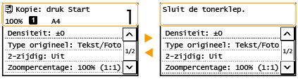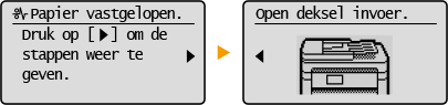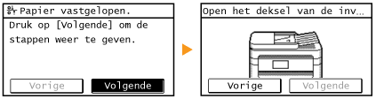 In sommige gevallen worden, wanneer er een fout optreedt, instructies weergegeven over hoe u moet reageren. Volg de aanwijzingen op het scherm voor het oplossen van het probleem. Het scherm dat wordt weergegeven wanneer er zich een papierstoring voordoet, wordt hieronder getoond als voorbeeld.
