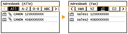 U kunt veelgebruikte bestemmingen opslaan in het fax/scanadresboek en eenvoudig selecteren als u ze nodig hebt (Bestemmingen opslaan in het adresboek). U kunt bestemmingen alfabetisch zoeken, kiezen uit lijsten in het adresboek of invoeren via een code van drie cijfers (codes voor verkort kiezen). Daarnaast kunt u de volgende functies gebruiken om bestemmingen snel op te geven.