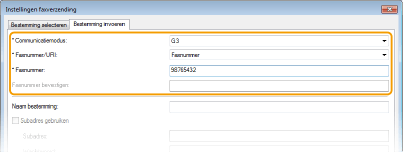 Stel de communicatiestand in en het faxnummer (of URI).