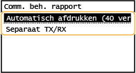 Selecteer <Aan> om het rapport automatisch af te drukken na 40 transmissies of <Uit> om het rapport handmatig af te drukken.
